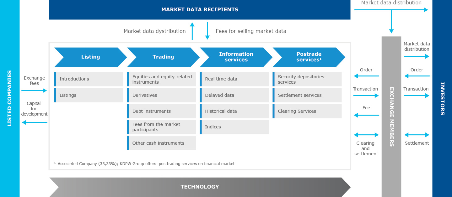 Business Model of GPW Group is focused on services on two important for the polish economy: financial and commodity markets. In both cases, the services offered cover the entire activity chain, from servicing issuers to posttrading services, generating value for listed companies, recipients of information and Exchange Members, and consequently for investors and the entire economy.