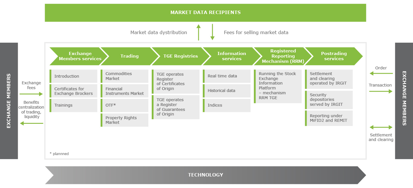 Commodity exchange offers trading, among others, in electricity, natural gas, emission allowances, property rights in certificates of origin of electricity, certificates of origin of biogas and energy efficiency certificates and commodity derivatives settled in cash.