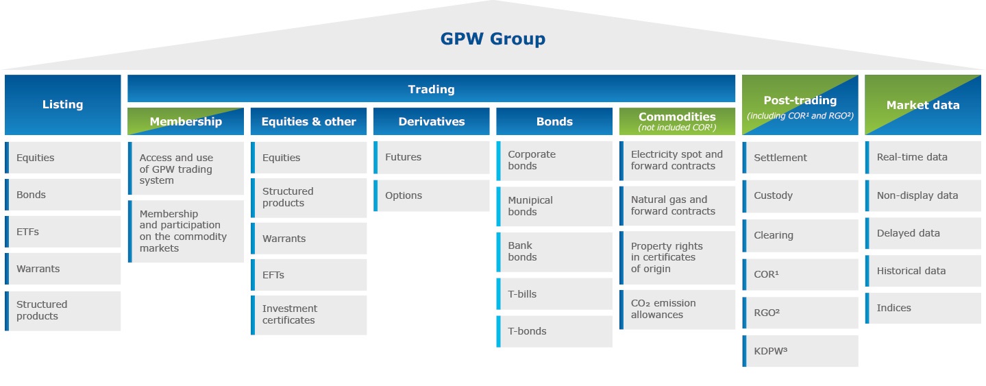 Post-trade services for the financial market operated by GPW and BondSpot, including depository, clearing and settlement services, are offered by GPW’s associate, Krajowy Depozyt Papierów Wartościowych S.A. (KDPW), and its subsidiary KDPW_CCP S.A.