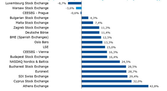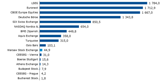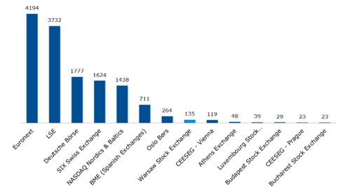 The biggest exchange in Europe is the Euronext Group (EUR 4,194 billion) followed by the LSE Group (EUR 3,732 billion) and Deutsche Boerse (EUR 1,777 billion). With a capitalisation of EUR 135 billion, GPW ranks eighth in Europe and it is by far the biggest market in CEE.