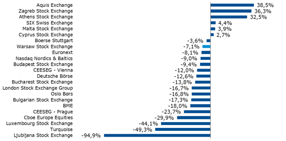 Change in the value of trade in shares on the electronic order book on European exchanges in 2019 [% change in EUR]