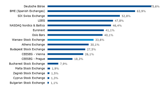 According to FESE statistics, the value of trade in stocks on the electronic order book on GPW was EUR 44.9 billion in 2019, equal to a market share of approximately 0.48% in the European market. GPW remained a strong CEE leader by the value of trade in shares in 2019, ahead of CEESEG Vienna.