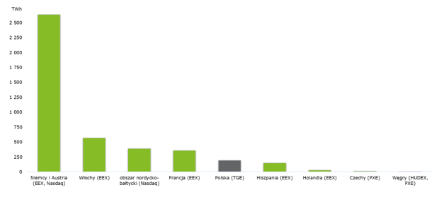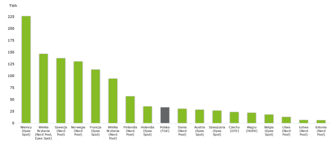 - Poland is the EU’s fifth and the CEE’s first biggest electricity consumer. International connections with the biggest European electricity market (Germany), the highly liquid Nordic market, the Lithuanian, Czech and Slovak markets, as well as the big Ukrainian market position Poland as a key member of the region and make Towarowa Giełda Energii a strategic partner. TGE plays a key role in generating trade in electricity. The Polish market is distinctive due to a high share of forward trade, which remained strong in 2019. Combined with a strong increase in spot transactions, the annual electricity turnover hit new highs. The turnover volume on the Polish exchange represented 135% of the total electricity volume supplied into the grid in 2019, which puts Poland on a par with the most developed EU member states and exceeds by far the liquidity of many other exchanges of the region. Towarowa Giełda Energii has become a well-established partner on the European electricity market. For more than a year now, all transactions have been made on the regulated market, which in Poland is within the exclusive remit of TGE. Thus, the legislator decided to create a very competitive market ensuring equal access for all participants. The position of TGE on the electricity market has been growing stronger over the years and the turnover reached all-time highs in 2019. Our Members purchased more than 229 TWh of electricity for Western European market areas; the share of spot transactions in the total exchange turnover dropped to 15.5%.