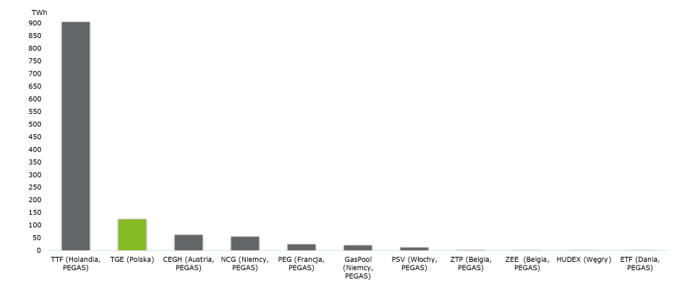 - Similar to electricity, the Polish natural gas market is among the biggest markets in the European Union. The domestic consumption volume ranks Poland Europe’s sixth biggest player. Poland’s dependence on imports is low compared to most EU member states while recent and upcoming investments ensure diversification of the sources of gas imports. The Polish natural gas market is connected to pipelines in Germany, the Czech Republic, Belarus, and Ukraine. That list should in fact include all countries with access to LNG infrastructure. The LNG terminal in Świnoujście is the window to the world of the Polish gas system. European gas markets have different specificities. Poland has a relatively small spot market while trade concentrates on the forward market. As a result, forward transactions in gas exceed the volumes reported in Germany or France. The Netherlands has historically boasted the highest turnover. Members of Towarowa Giełda Energii have traded in gas on the spot and forward market for six years now. With active participation in market liberalisation, continued expansion of the product offer, and earned confidence, Poland has developed the biggest gas trading platform in the region. TGE’s gas market is young compared to its electricity market. Turnover volumes in 2012 and 2013 were very low. Starting in 2014, turnover exceeded 50% of domestic gas consumption. Similar to electricity, the gas market broke new records in 2019 and reported turnover at 146 TWh.