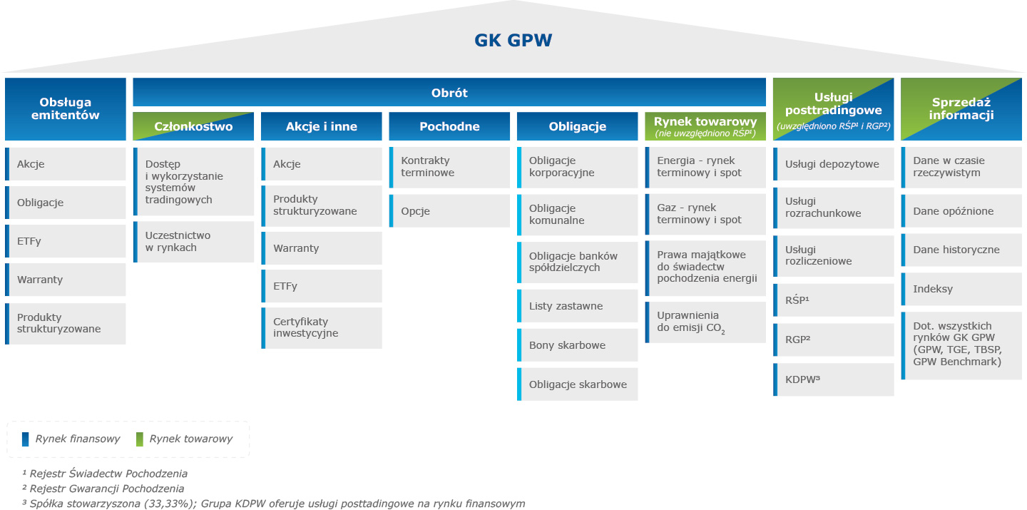 Grupa Kapitałowa GPW obejmuje najważniejsze instytucje rynku kapitałowego i towarowego w Polsce i jest największą giełdą w regionie Europy Środkowo – Wschodniej. Głównym podmiotem Grupy jest Giełda Papierów Wartościowych w Warszawie S.A. (GPW S.A.), która organizuje obrót instrumentami finansowymi, a poprzez liczne inicjatywy edukacyjne dba o szerzenie wiedzy ekonomicznej w społeczeństwie. GPW S.A. to najważniejsze źródło pozyskiwania kapitału dla przedsiębiorstw i samorządów w regionie, które przyczynia się do dynamicznego rozwoju polskiej gospodarki, nowych miejsc pracy, konkurencyjności polskich przedsiębiorstw na arenie międzynarodowej i w efekcie wzrostu zamożności polskiego społeczeństwa. Obecność na rynku kapitałowym przynosi polskim przedsiębiorcom także inne korzyści, takie jak wzrost rozpoznawalności, wiarygodności, efektywności i przejrzystości zarządzania.